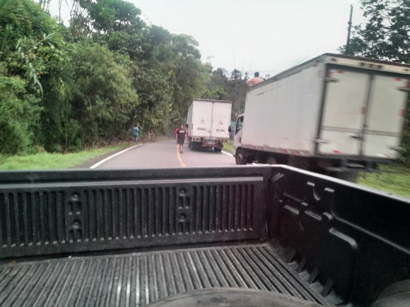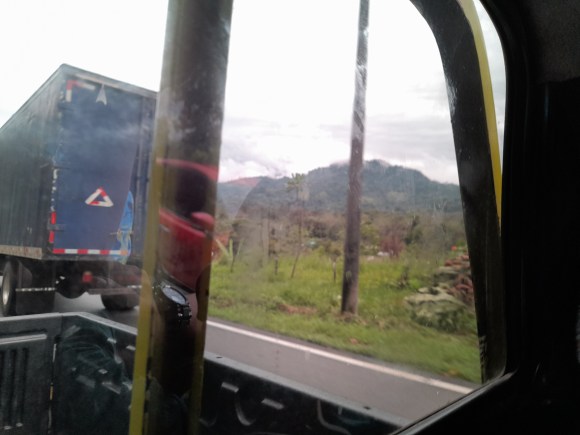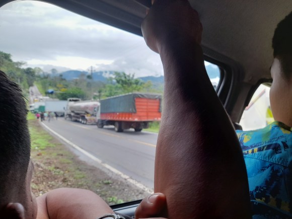 Tandis que nous approchons de Chiriqui Grande, moins empêchée que la route vers Altamirante, et que donc nous allons quitter les barrages et arriver à bon port, une longue file de camions quittant l’île, sans doute débarquant de la barge (« Mercedes », c’est le nom de la barge) qui relie Colon au continent, invite à penser le blocus qui commence.