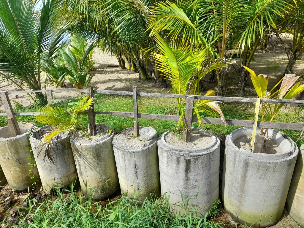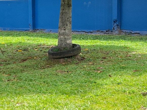 quand l’objet industriel revalorisé devient autre chose : ci-dessous, un pneu sous des racines de cocotiers. Très peu visible, semble amalgamé avec l’arbre