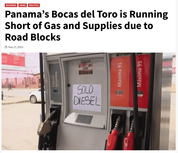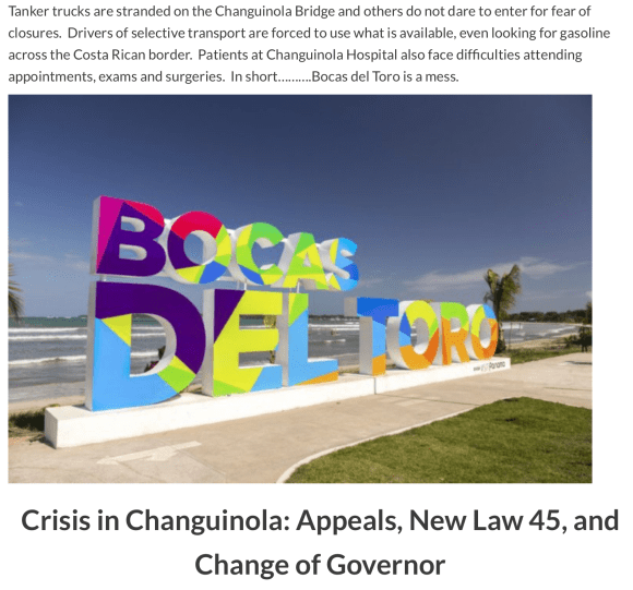 Cependant, la fermeture des routes par les protestataires engendrera une nouvelle fois la pénurie à cause de la diminution des approvisionnements en gaz, essence, touristes, e. a. à Bocas, la ville de l’île de Colon. => la suite du chapitre « politique« ici en français et ici en espagnol.