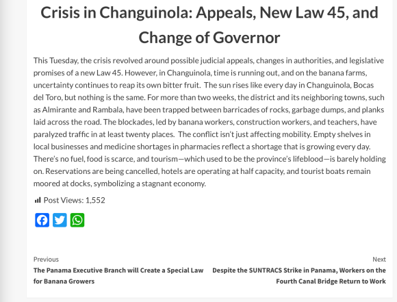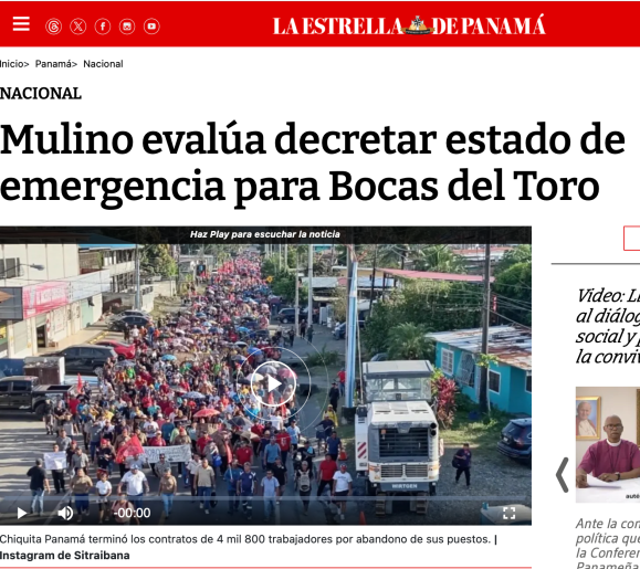 Cette grève, qui conteste une réforme des retraites approuvée par le Congrès, est suivie par les employés de la filiale panaméenne de l’entreprise états-unienne Chiquita Brands. La firme bananière emploie directement 7000 salariés. L’entreprise menace de licencier les quelque 4 500 salariés grévistes s’ils ne reprennent pas le travail. La grève et les occupations de sites et coupures de route a affecté particulièrement la région de Bocas del Toro qui vit des plantations de bananes et du tourisme, paralysant de nombreuses activités, rapporte l’AFP. Source :https://www.rfi.fr/fr/en-bref/20250520-panama-un-juge-déclare-illégale-une-grève-observée-depuis-trois-semaines-par-des-milliers-de-salariés-de-l-entreprise-bananière-us-chiquitaContra la minera, Octubre, diciembre 2023