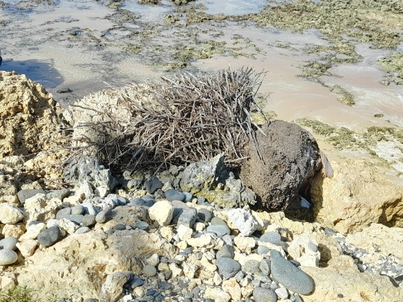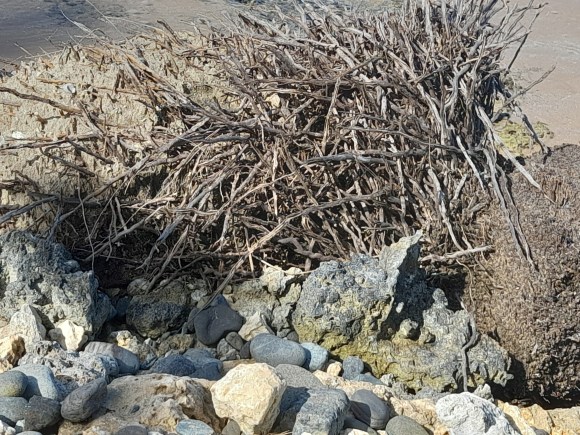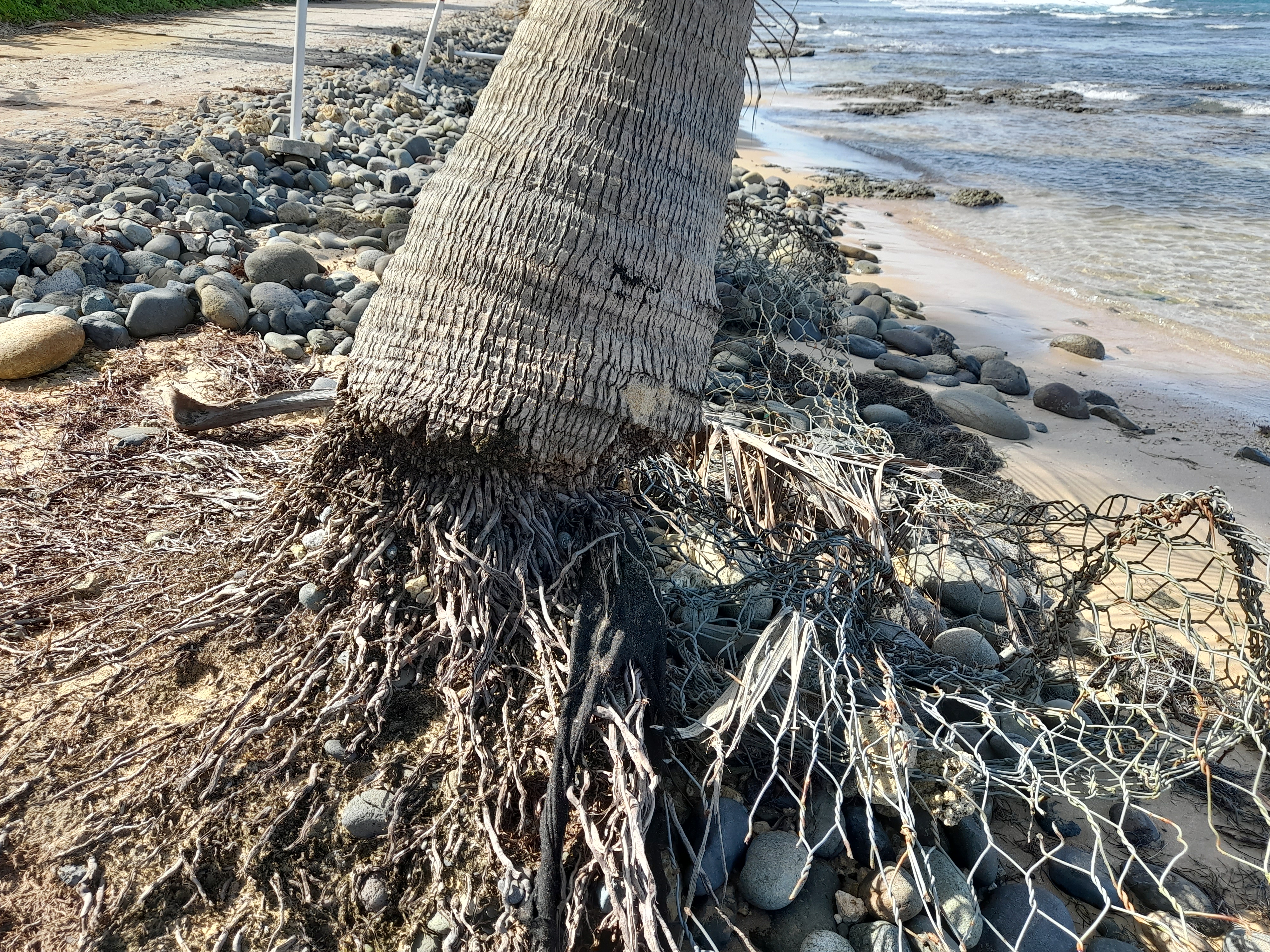 érosion et amalgames : arbre, tissu noir épais, grillage & pierres, éléments épars du mur anti-érosion … érodé. On s’aperçoit que l’arbre est rongé du côté de la mer. Et sans doute risque-t-il de terminer comme ça :