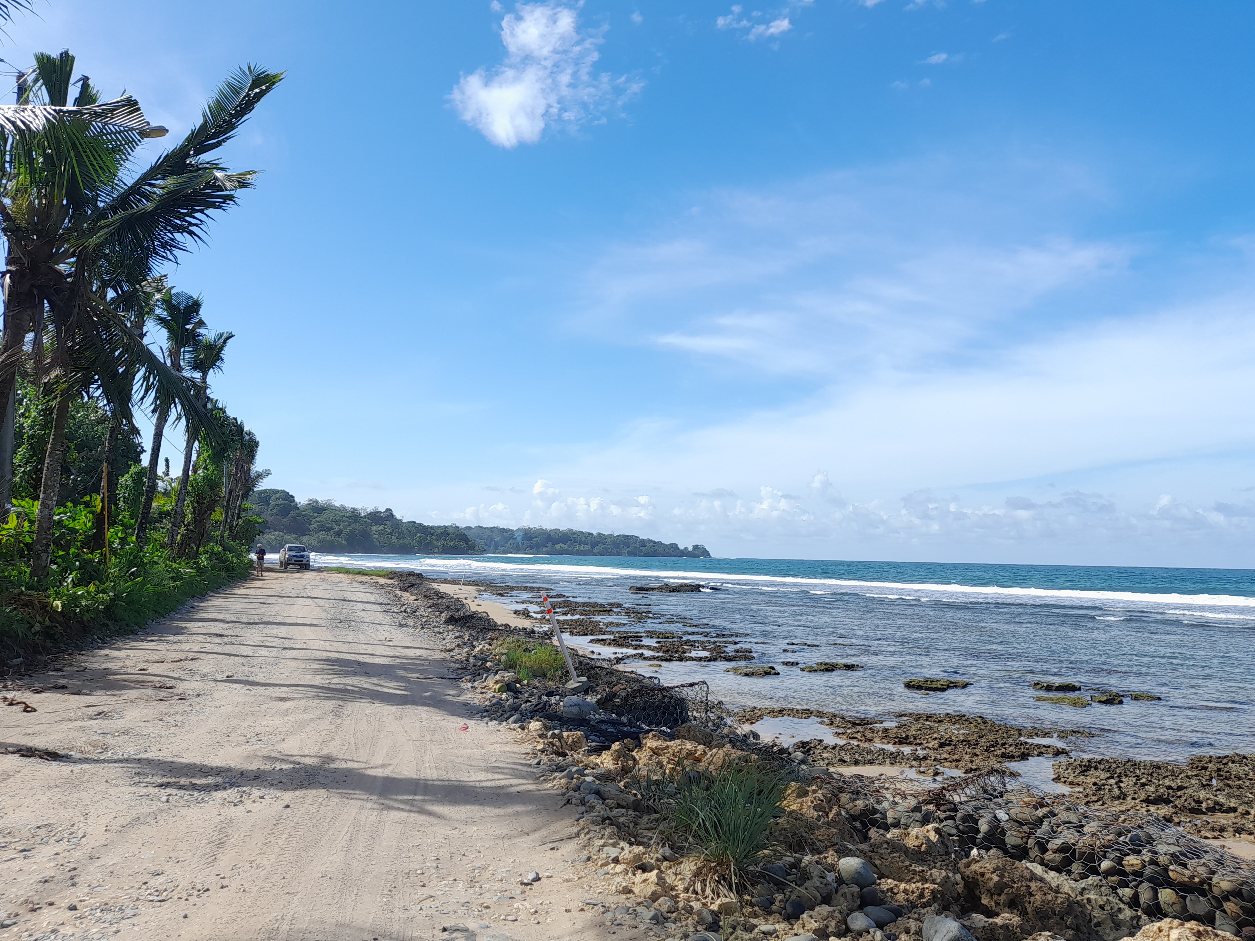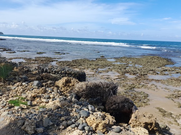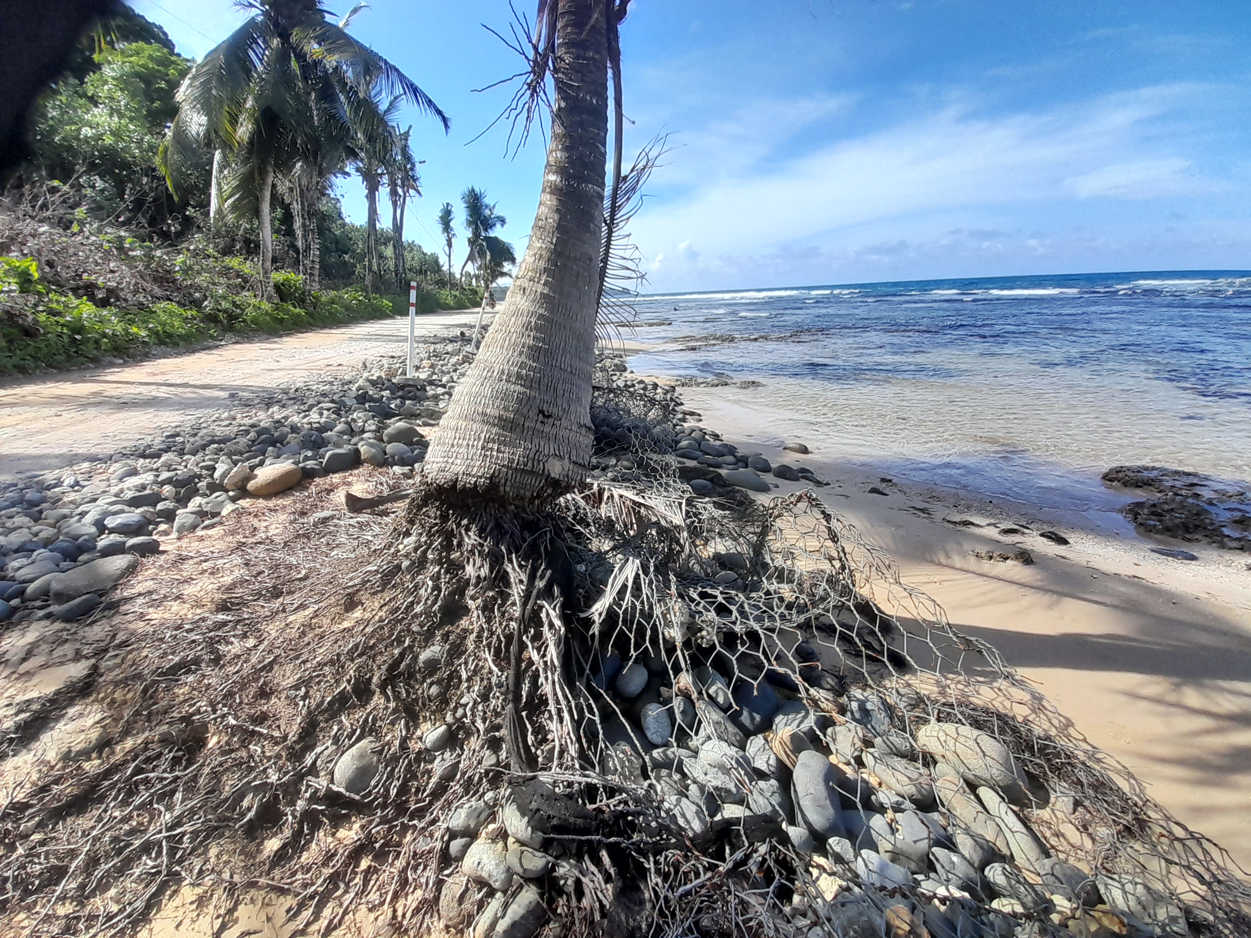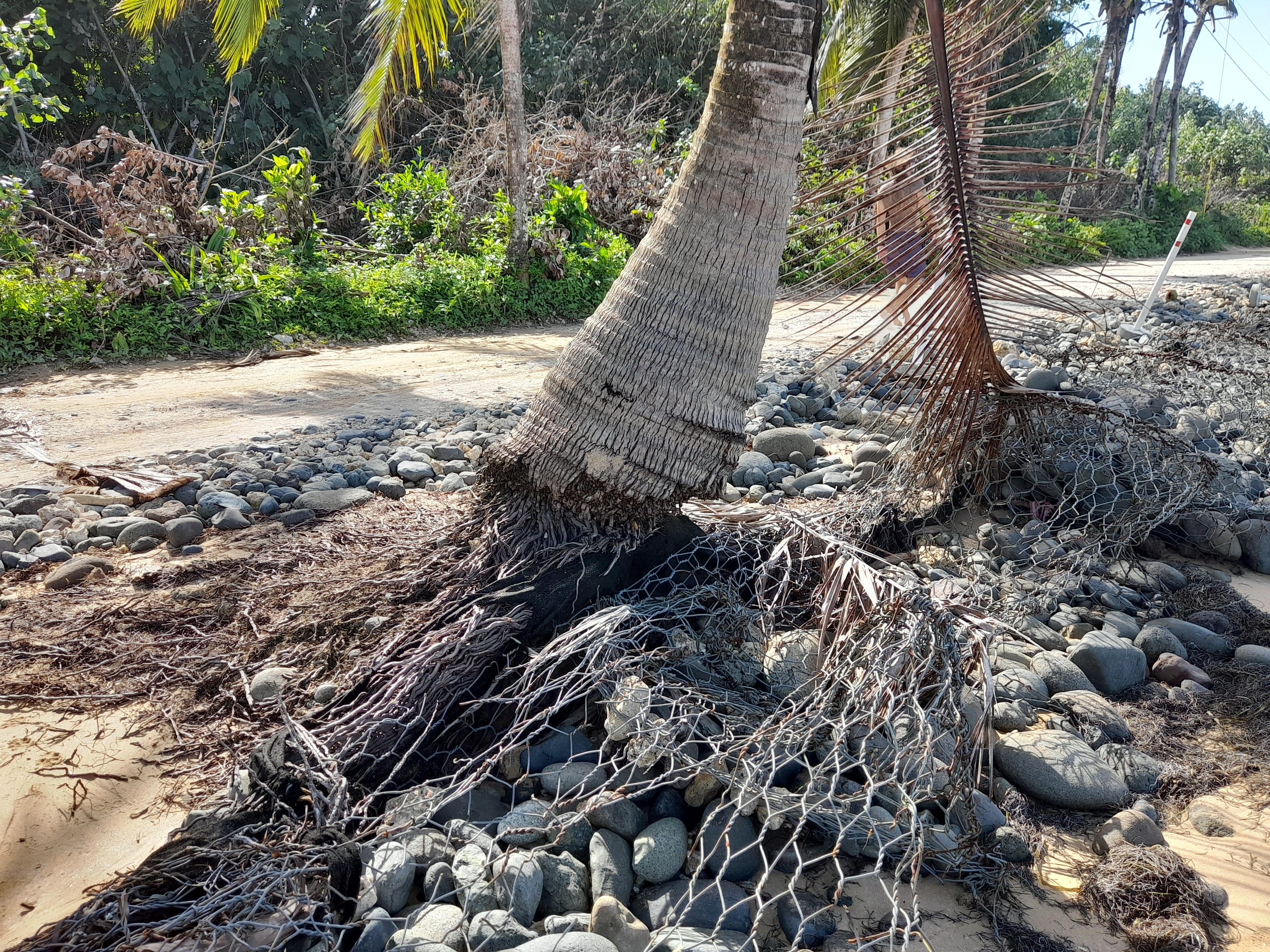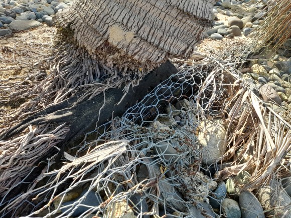 Mai 2025. Marée basse. On aperçoit les racines des végétaux durement éprouvés par les vagues. La photographie de droite, plan large du même endroit, montre l’ancien grillage, vidés de ses pierres,