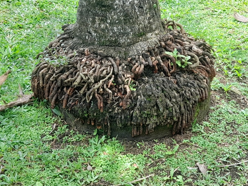 - Deuxième photo : Un autre arbre (ou le même, à un stade ultérieur ?) a littéralement absorbé le pneu. Celui-ci est devenu presque invisible, enveloppé par les racines et l’écorce. Il subsiste une forme circulaire sombre, vestige de l’objet d’origine.