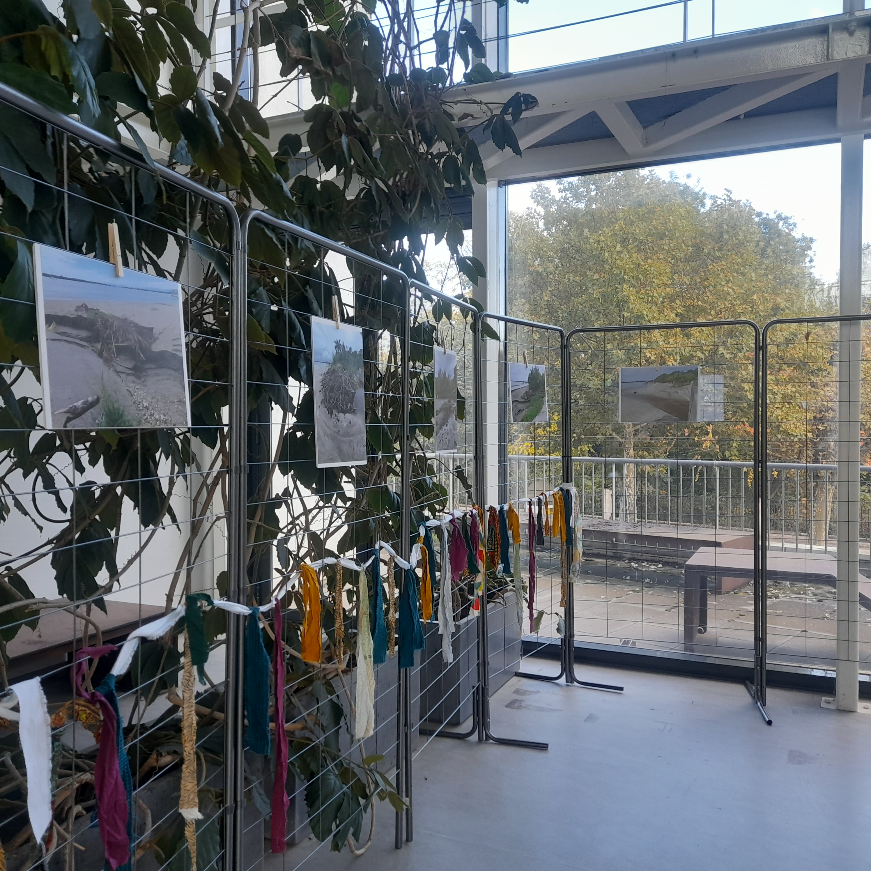 13 au matin, j’arrive, et nous installons efficacement l’exposition. Aline ajoute une petite touche de textiles aux pinces à linges.