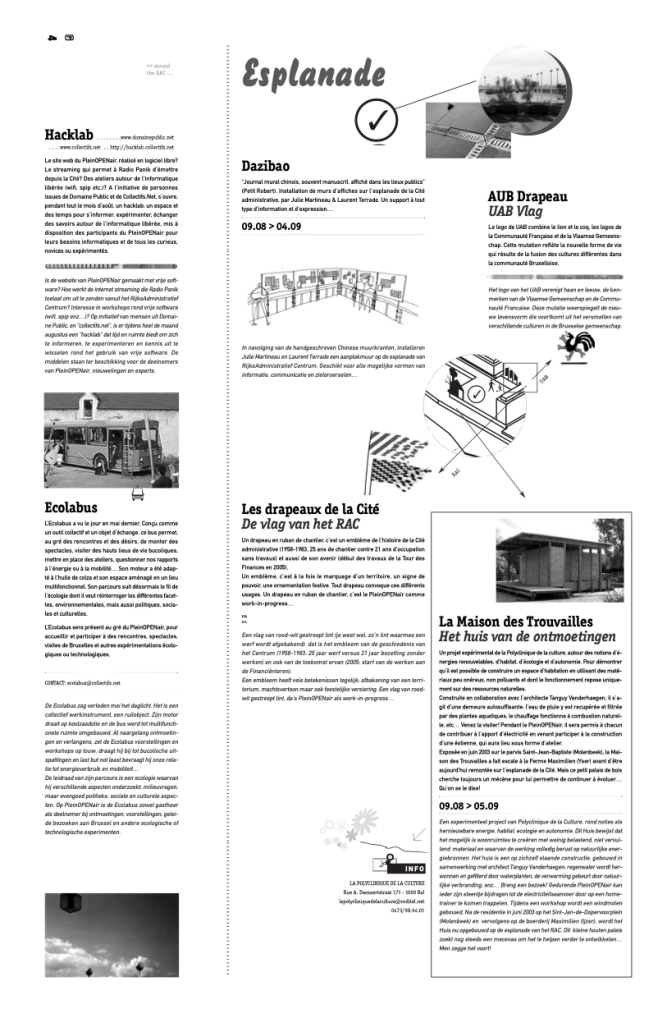Envie de grandeur collective. La Tour des Finances est immense. Nous l’avons « remplie » de projets, ateliers, événements, visites. Lui avons rendues hommages et fait déguster des frites dans un camion posé sur l’esplanade. Souvenirs de fleurs de marguerites, de roseaux qui chantent, d’une radio Panik et d’écrans de cinéma bien sûr. Cette occupation poursuivait le Maprac. Et ces aventures avaient échaudé nombre d’artistes, d’a’rchitectes, … Au même moment, les ateliers Mommens s’émancipent de la propriété individuelle. Elle et moi nous croisions, « un café bientôt ? Une pause ? Mais l’espace est gigantesque. il fallait arpenter.