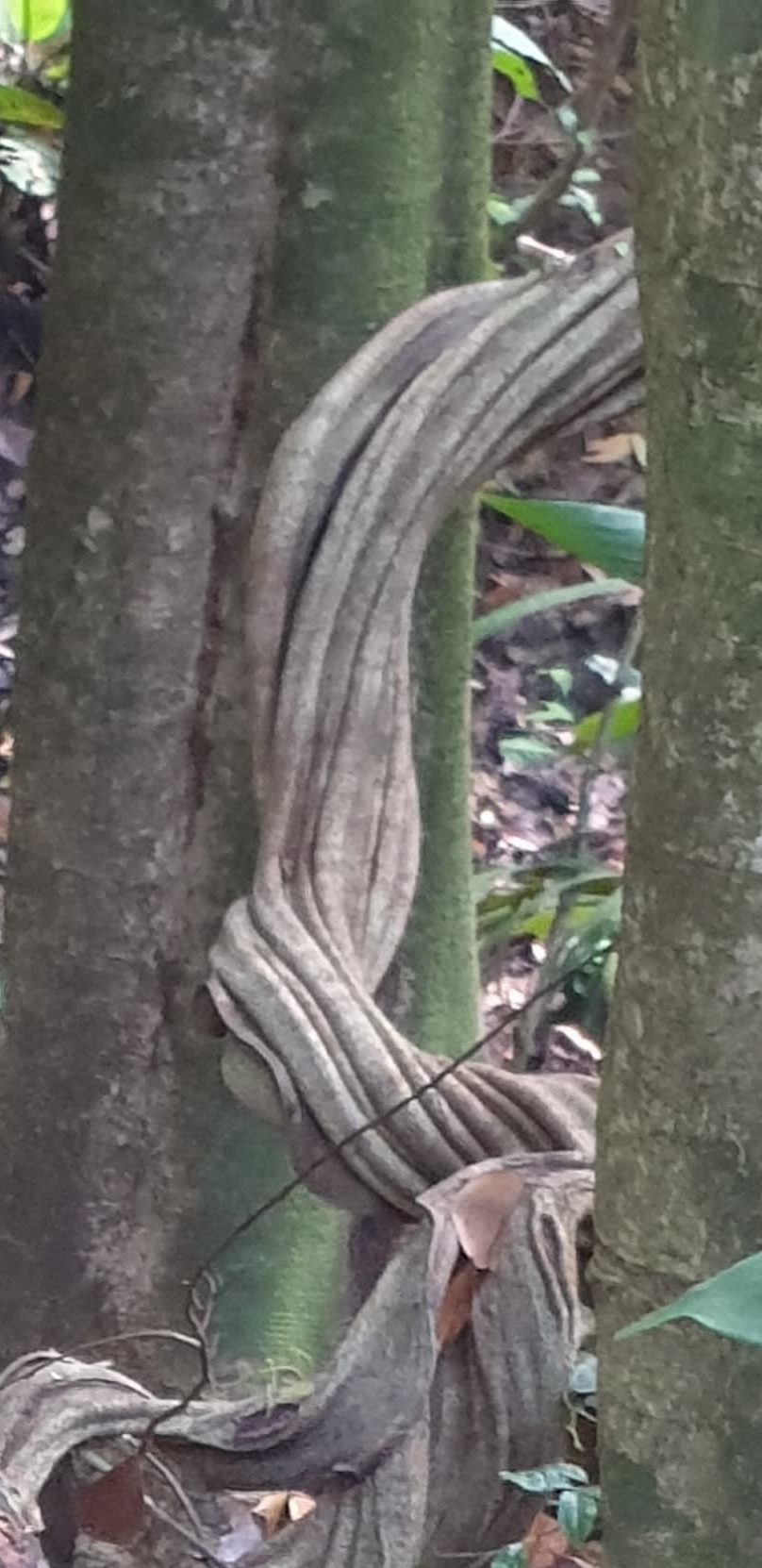 Aucune photographie de moi, juste une description, je sue, je m’agrippe, grimpe, chute, et m’agrippe, glisse, bref, très vite je suis exténuée… Ci-dessous, je vous devine curieux de regarder avec curiosité une drôle de racine, qui se balade et se tord, sur les deux dernières photographies ; c’est de l’ayahuasca. Ci-dessous en effet loupe.