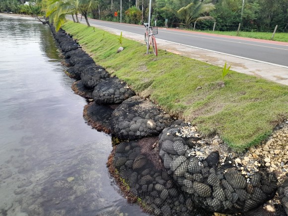 gestion de l’eau : on observe que la protection anti-érosion mis en place par les pouvoirs publics a été détruite par les marées. 2023, avant la rénovation
